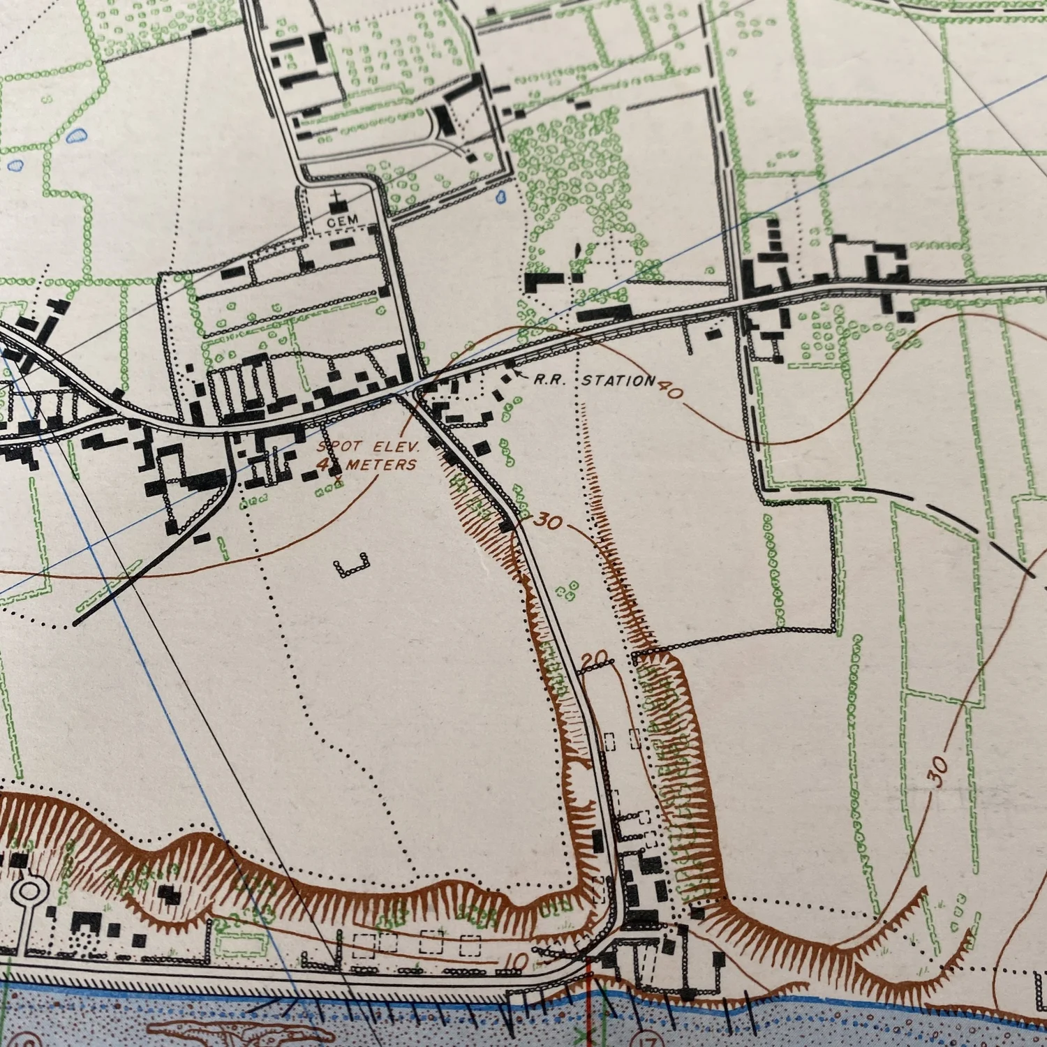 But nothing was more secret—or more vital to Operation Neptune—than the mosaic of Allied intelligence reports that cartographers and artists transformed into the multihued and multilayered BIGOT maps. On them were portrayed details of Hitler’s vaunted Atlantic Wall, a network of coastal defenses, designed to repel invaders. To discover what the Allied invaders faced, American, British, and French operatives risked their lives—and sometimes gave their lives—in the process of filling in the BIGOT maps. Revelations about Normandy’s undulating seafloor came from frogmen who also got sand samples on beaches patrolled by German sentries. Such BIGOT map notations as ‘antitank ditch around strongpoint’ or ‘hedgehogs 30 to 35 feet (9 to 10 meters) apart’ were often the gifts of French patriots.” Notations in red on the map here offered to include: “Probably Mined” and three areas marked “Drainage Ditch.” Allen writes that “French laborers conscripted by the Nazis paced distances between obstacles or kept track of German troop movements… BIGOT maps began with information gleaned from old scenic postcards of the Normandy coast and charts from the Napoleonic era. Next came the special deliveries from the French Resistance. Then in mid-May 1944, BIGOT mapmakers asked for low-level aerial photos of the coast. Pilots trained to fly at 10,000 feet, called this wave-top flying ‘diving’ because they felt that in their unarmed and unarmored aircraft they were rolling the dice with death.
