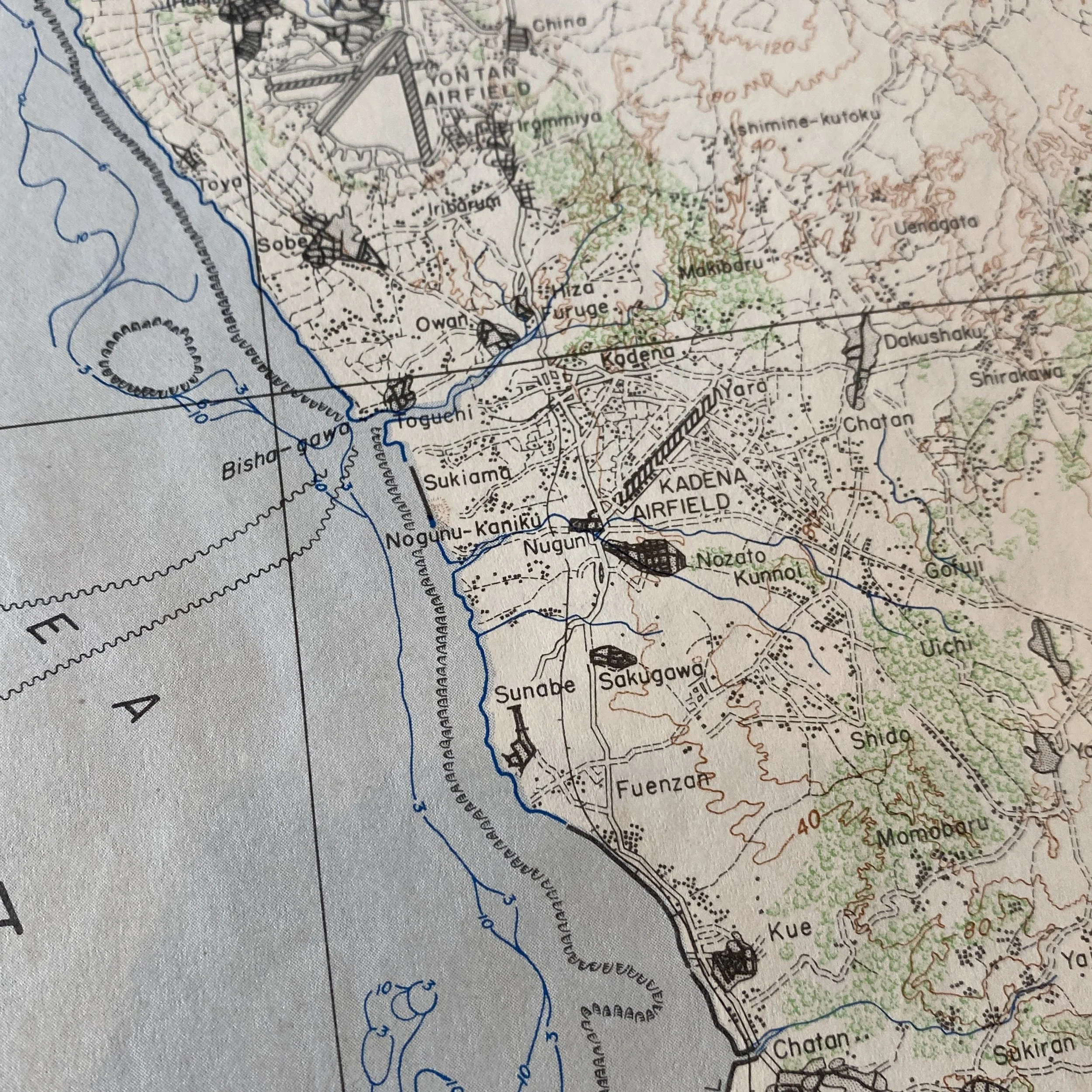 This rare and museum-grade Operation Iceberg (Invasion of Okinawa) invasion map is a very rare ADVANCED COPY dated January 1945. This CONFIDENTIAL marked advanced copy was distributed to officers and higher-ranking generals. This D-Day invasion map showcases one-half section of the island and shows important objective landmarks such as Hagushi Bay (D-Day landing locations of the 6th, 1st, 7th and 96th Divisions) as well as multiple airfields, Isado, the infamous Sugar Load Hill and the Shuri Line where the Japanese withdrew on May 21st. This map was created by the 64th Engineers. A special and rare feature of this map shows the detailed airfields and mountains with a unique view of important landmarks within the island. This would have been very helpful and used as a visual marker for an infantryman to better identify these more notable landmarks when planning their attack on Okinawa. Being produced in 1945 the Army wanted to give the infantry soldiers on the ground attacking Okinawa the most updated information. This lower sector of the island of Okinawa is where the 7th and 96th Divisions pushed towards the Shuri Line. This map in-particular was a US bring back and was found in the collection of 4 other RESTRICTED and SECRET Okinawa landing maps.
